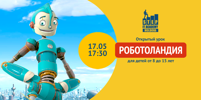- Открытый урок. 17.30. Вход свободный! Приглашаем детей от 8 до 15 лет и их родителей провести незабываемое время в JUNIOR STEP IT Academy Moldova — узнайте тайну создания и программирования роботов! Вместе мы совершим увлекательное путешествие в Роботоладию – мир, где живут роботы. Каждый сможет попробовать поуправлять роботами самостоятельно! Ваш ребенок увидит, что роботов можно создавать самостоятельно: не только собирать их из отдельных частей, но и программировать. Для этого необходимы всего лишь запчасти LEGO, фантазия и знание основ программирования. Откройте для себя увлекательный мир робототехники!Адрес: сектор Ботаника, бул.Дечебал, 139, 3-ий этаж. На двух языках. Регистрация обязательна! Телефон:+373 22 854 680;(+373 22) 854 688. Источник: JUNIOR STEP IT Academy Moldova