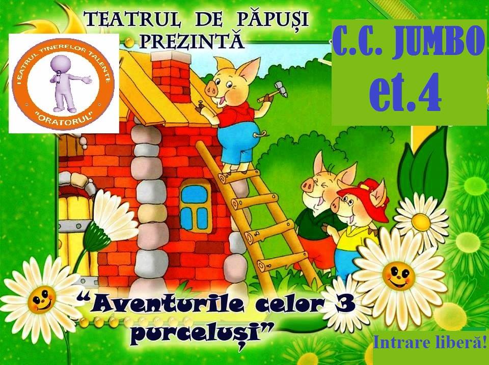 - Театр в «JUMBO». 13.00. (ro) Intrare este libera! Spectacolul «Aventurile celor 3 Purcelusi» la Jumbo! Aventurile celor mai hazlii Purcelusi revin la Jumbo! Va asteptam! Disponibil tuturor.Organizatorilor: Teatrul Tinerelor Talente «Oratorul» -tel:0793 84 184. Adresa: bv.Decebal,23/1.