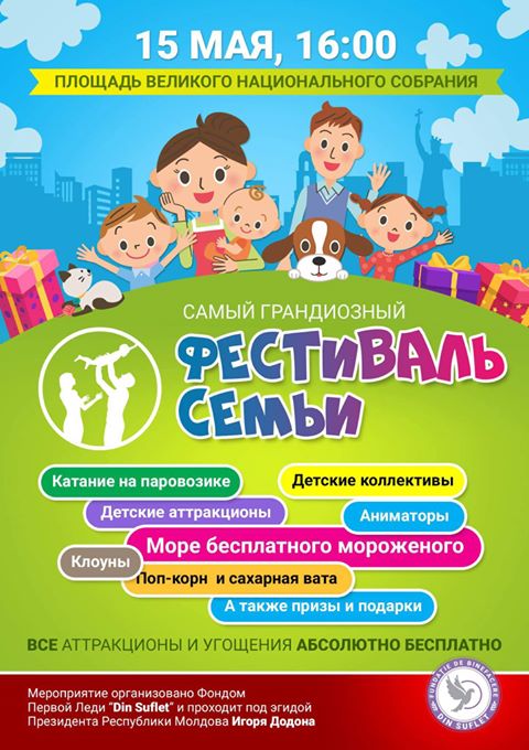 - Фестиваль Семьи.16.00. Вход свободный! Мероприятие организовано Фондом Первой Леди «Din Suflet» и проходит под эгидой Президента Республики Молдова Игоря Додона. Вас ждет море бесплатного мороженого! Детские аттракционы! Поп- корн и сахарная вата! Клоуны! Катание на паровозике. Выступление детских коллективов. Аниматоры ВСЕ АТТРАКЦИОНЫ И УГОЩЕНИЯ АБСОЛЮТНО БЕСПЛАТНО! источник: https://detstvo.md/festival-semi-na-glavnoj-ploshhadi-goroda/