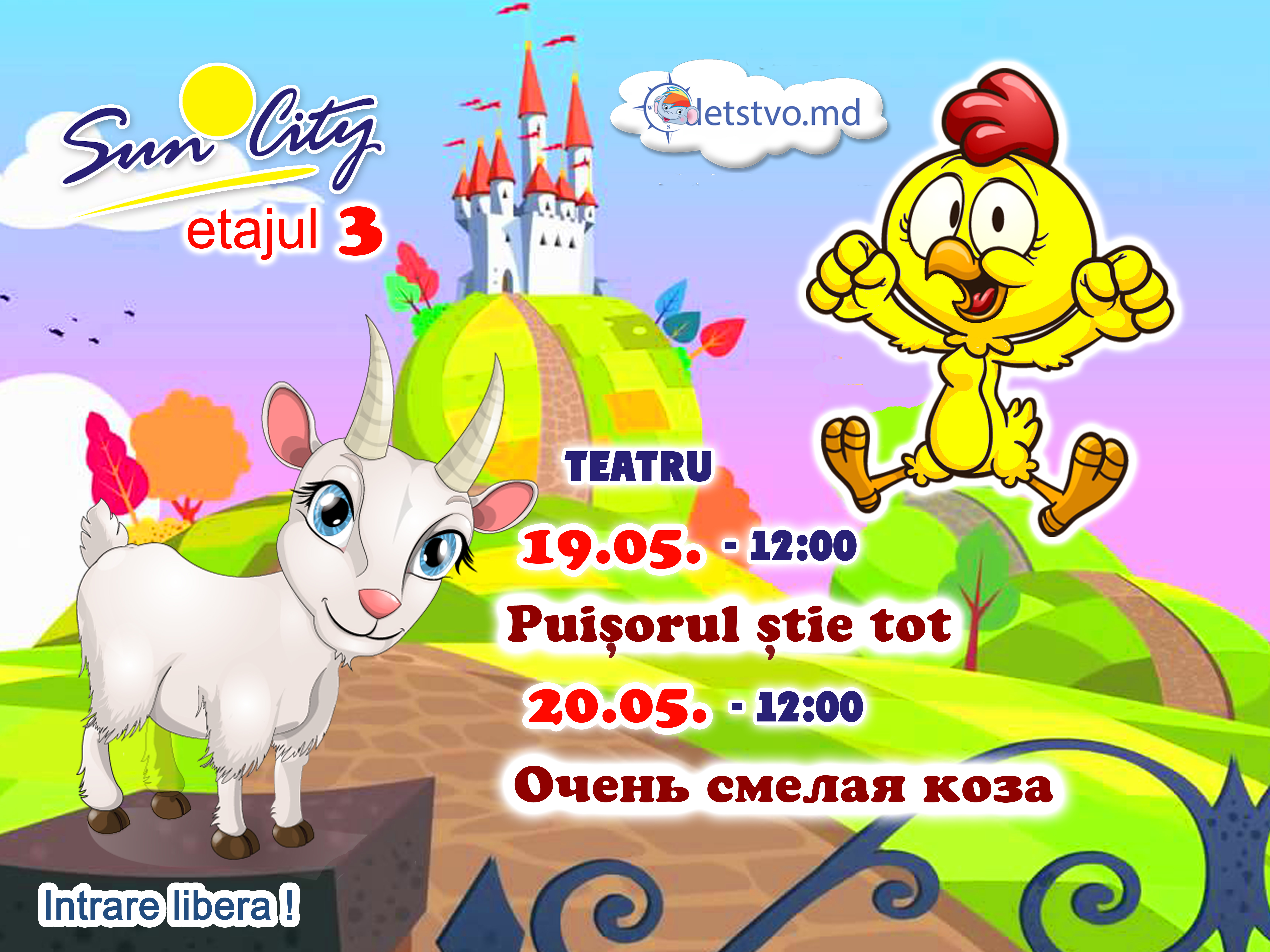 - Кукольный спектакль. 12.00.(ro) Вход свободный! ТЦ «Sun City» 3-ий этаж. Спектакль на румынском языке «Puișorul știe tot ». ТЦ “Sun City” приглашает Вас вновь на встречу со сказкой! Адрес: сектор Центр,ул.Пушкина,32,3-этаж.