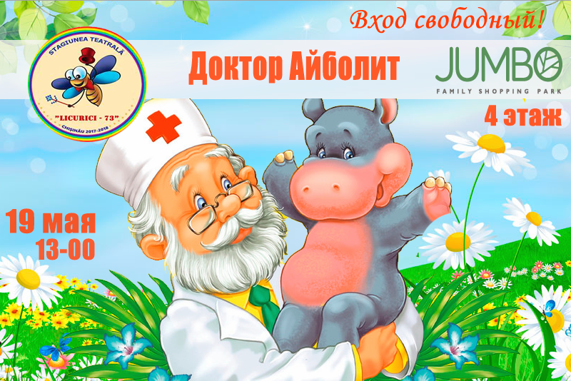- Театр в «JUMBO». 13.00. (ru) Вход свободный! Организаторы: Республиканский кукольный театр «Licurici». Спектакль «Доктор Айболит». Герои спектакля «ДОКТОР АЙБОЛИТ» ждут вас в субботу, в Торговом Центре «JUMBO» Jumbo, Торговый центр, бульвар Дечебал 23, 4-й этаж, на радость всех детей и родителей. Не пропустите музыкальное и весёлое представление на русском языке! Вход свободный! Приятного всем просмотра! Источник: facebook