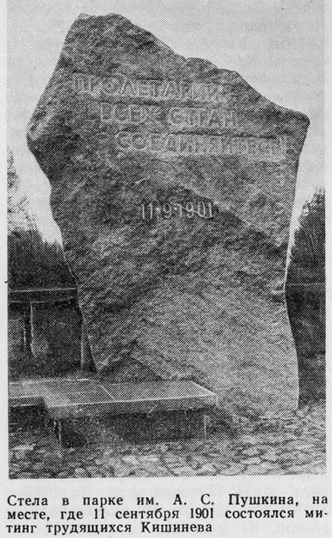 Это ведь именно здесь, в Парке Пушкина, со стороны улицы Гоголя (ныне — улица Митрополита Гавриила Бэнулеску-Бодони) стояла эта стела, установленная в 1975 году в Кишиневе ?Постамент, на котором отчетливо читаются сопроводительные событию слова на кириллице, непостижимым образом сохранился до наших дней.Стела была посвящена первой массовой политической демонстрации в Кишиневе, состоявшейся 11 сентября 1901 года.