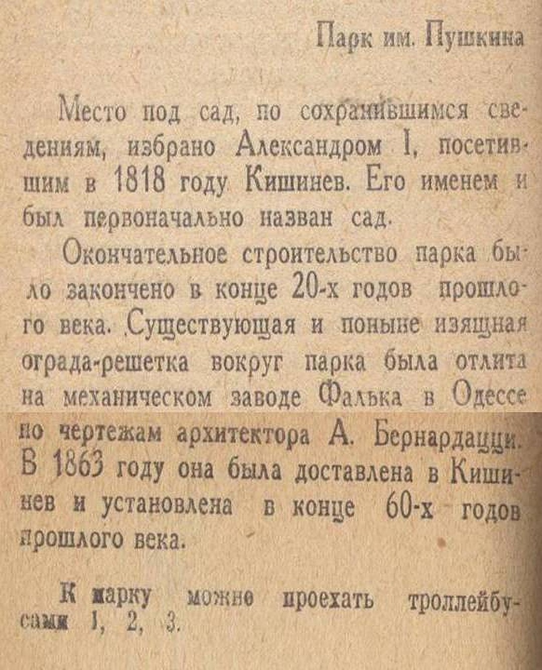 Вот что пишется об этом парке в “Кишинёв, Энциклопедия”, 1984 г. :“Парк им. А. С. Пушкина. (Фрунзенский район).Памятник садово-паркового искусства 19 века.Самый старый в Молдавии парк. Расположен в центр, части города. Пл. 7 га.Заложен в 1818. В конце 60-х гг. 19 в. был обнесен чугунной оградой (ар-хит. А. Бернардацци). Неоднократно реконструировался. В парк ведут 7 входов, имеются несколько бассейнов с фонтанами, скульптуры, детское кафе «Гугуцэ», городская Доска почета. Растут около 50 видов древесных пород, кустарников, лиан, в т. ч. редкие: слива Писсарда, бунду к канадский, китайская глициния и др. Сохранились несколько деревьев в возрасте более 160 лет, среди них акации, под к-рыми, согласно преданию, любил отдыхать А. С. Пушкин. Много цветов и клумб. Парк служит местом тихого отдыха. Здесь проводятся праздники поэзии, концерты. Памятники А. С. Пушкину, Стефану III Великому. В 1958 в парке была открыта Аллея классиков молдавской литературы. В 1964 заложена Аллея дружбы, а в 1975 открыта стела, посвященная Первой массовой политической демонстрации в Кишиневе 1901 (архит. Ф. Наумов). Парк охраняется государством.”